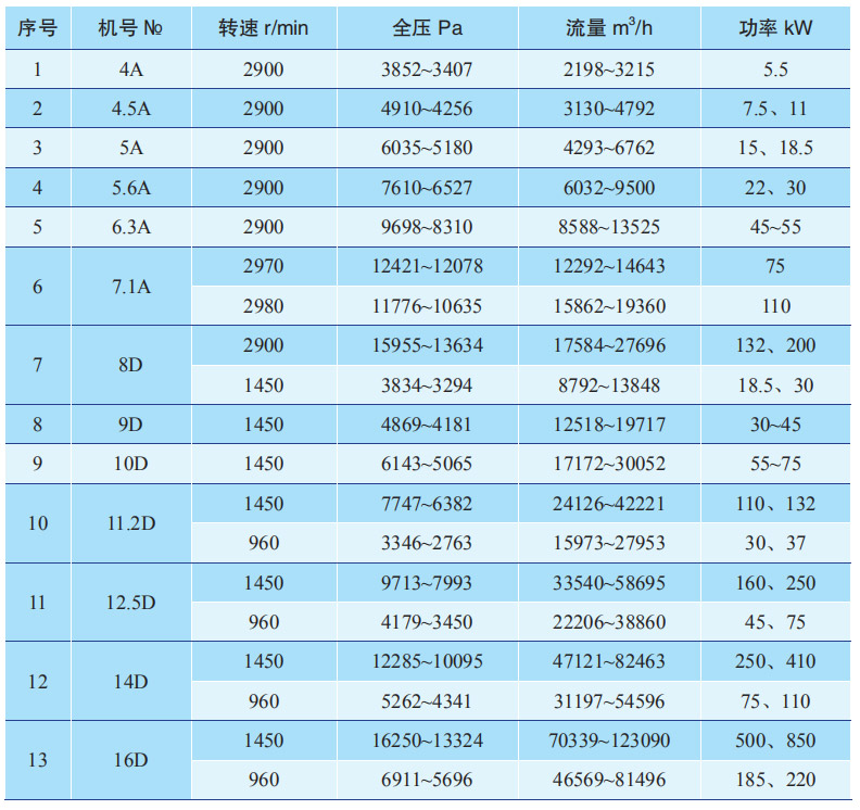 本風(fēng)機(jī)為單吸入式,通常有№4、4.5、5、5.6、6.3、7.1、8、9、10、11.2、12.5、14、16共13個(gè)機(jī)號(hào)。