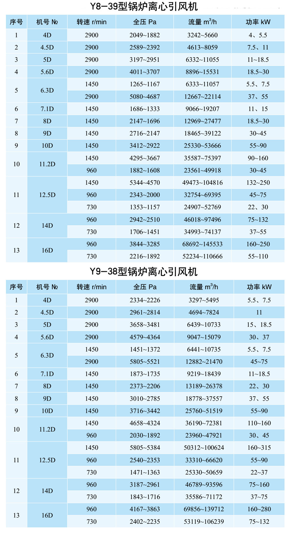 1、本風機制成單吸入,機號有№4、№5、№5.6、№6.3、№7.1、№8、№9、№10、№11.2、№12.5、№14、№16十三個機號。